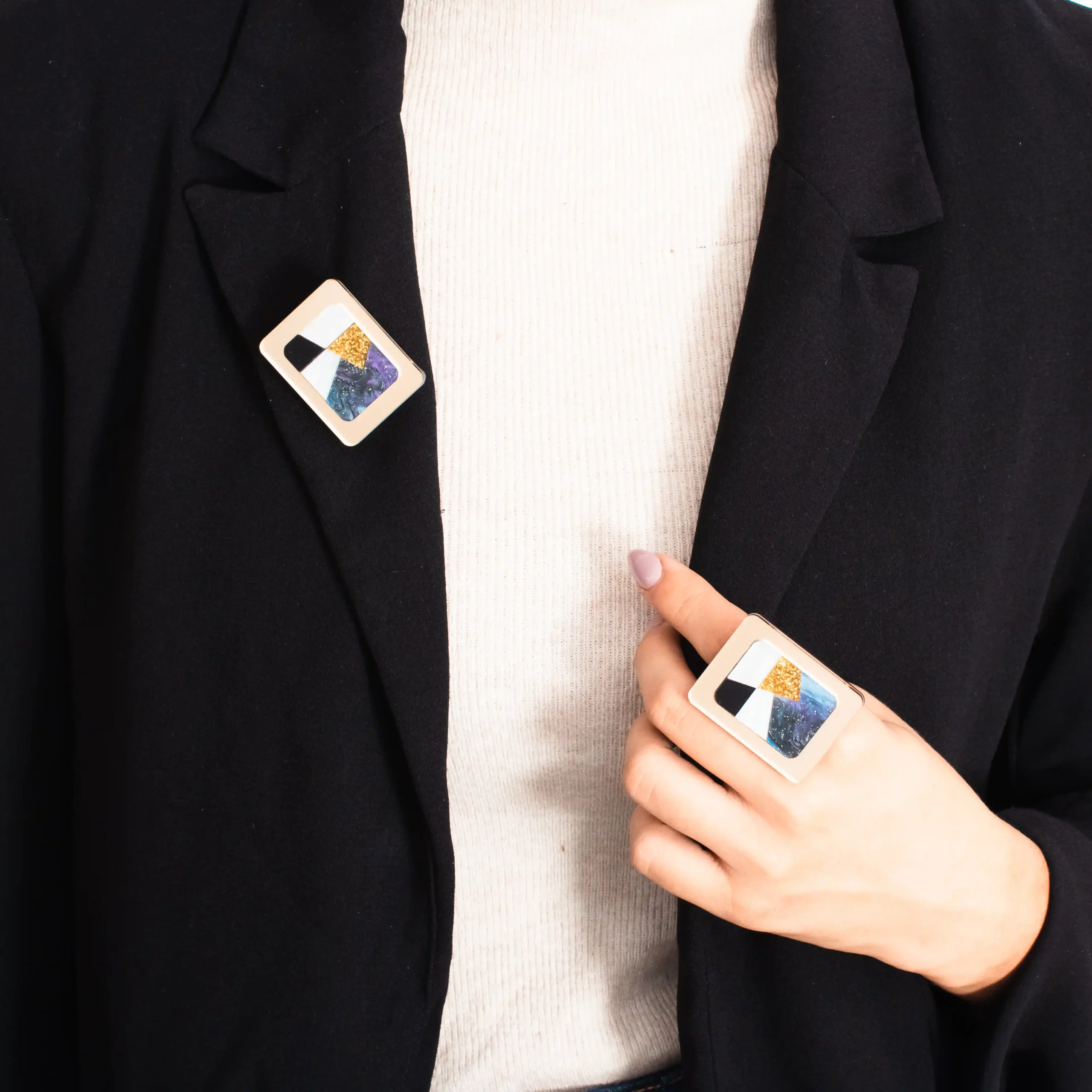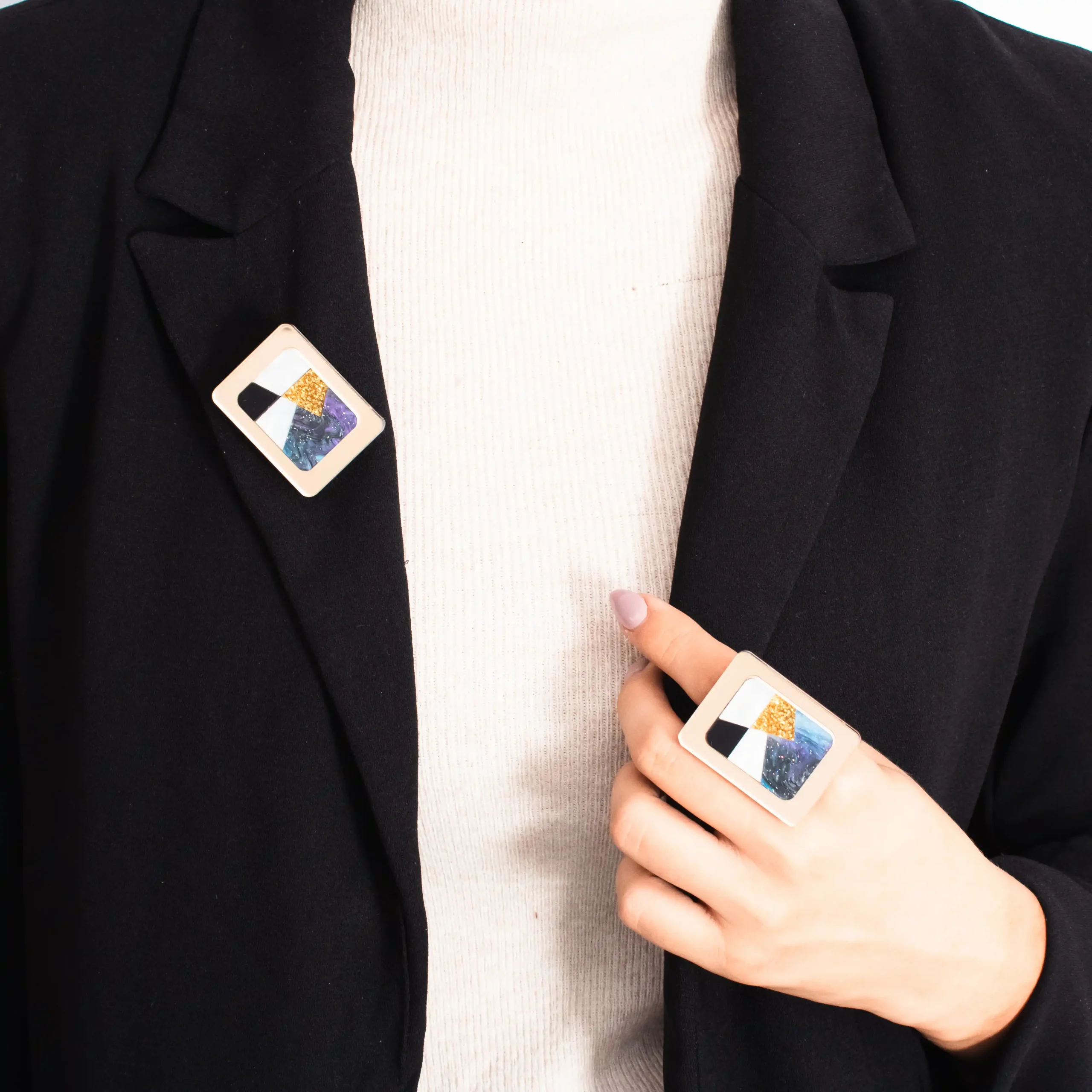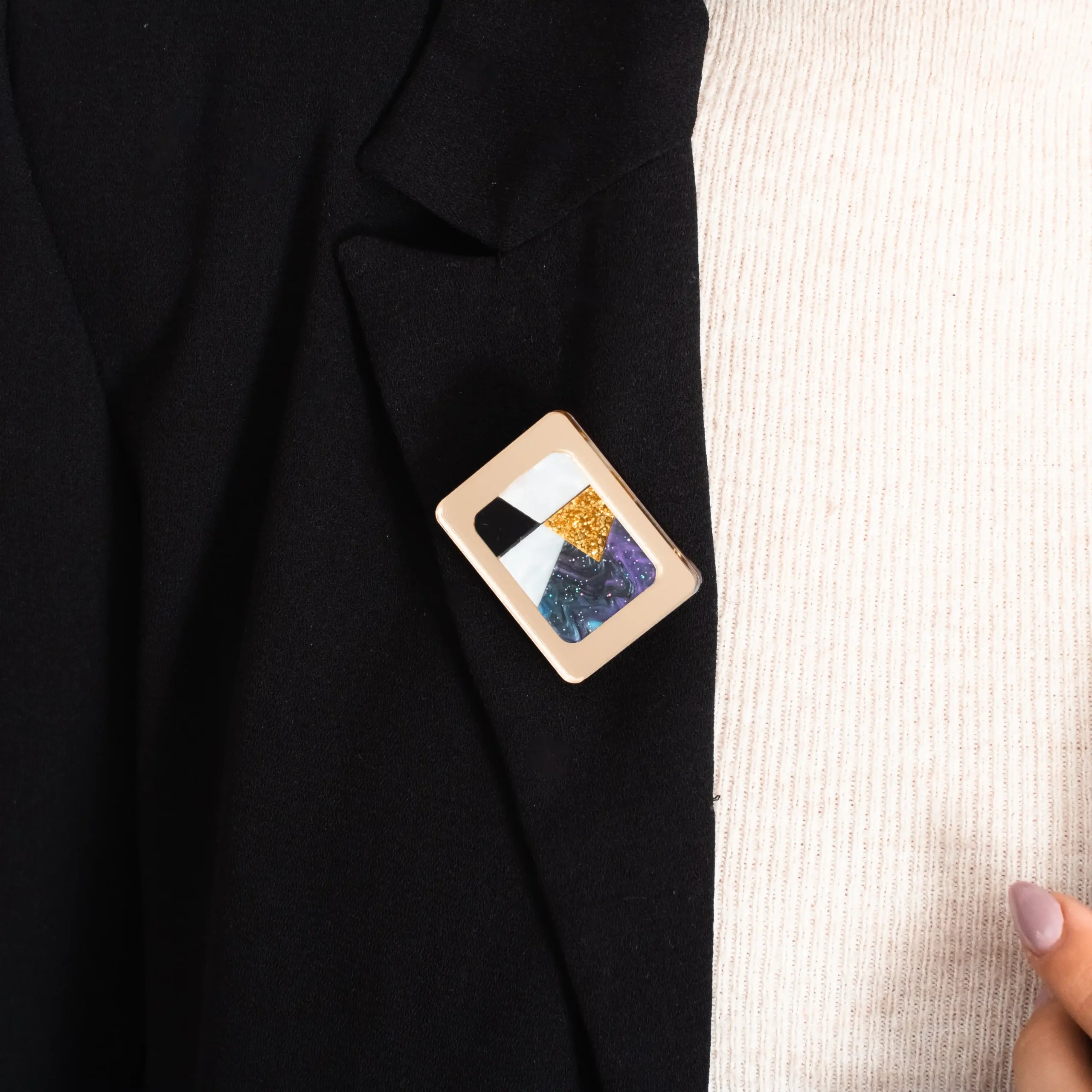 Broche LYSSA en metacrilato espejo y nacarado. Diseño limpio y luminoso con cierre tipo pin. Hecho a mano. Disponible en tres combinaciones de color. Colección NORSKA