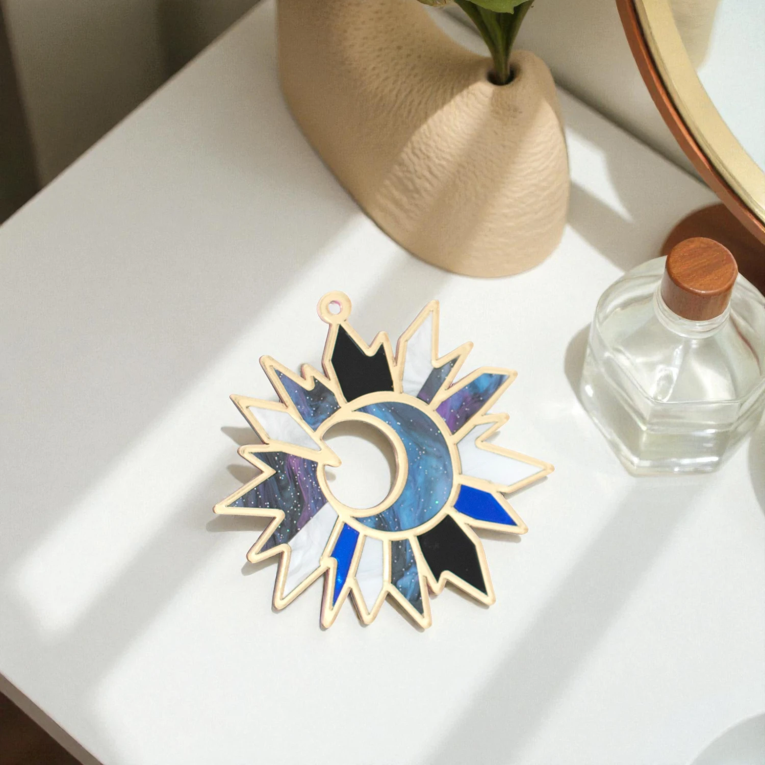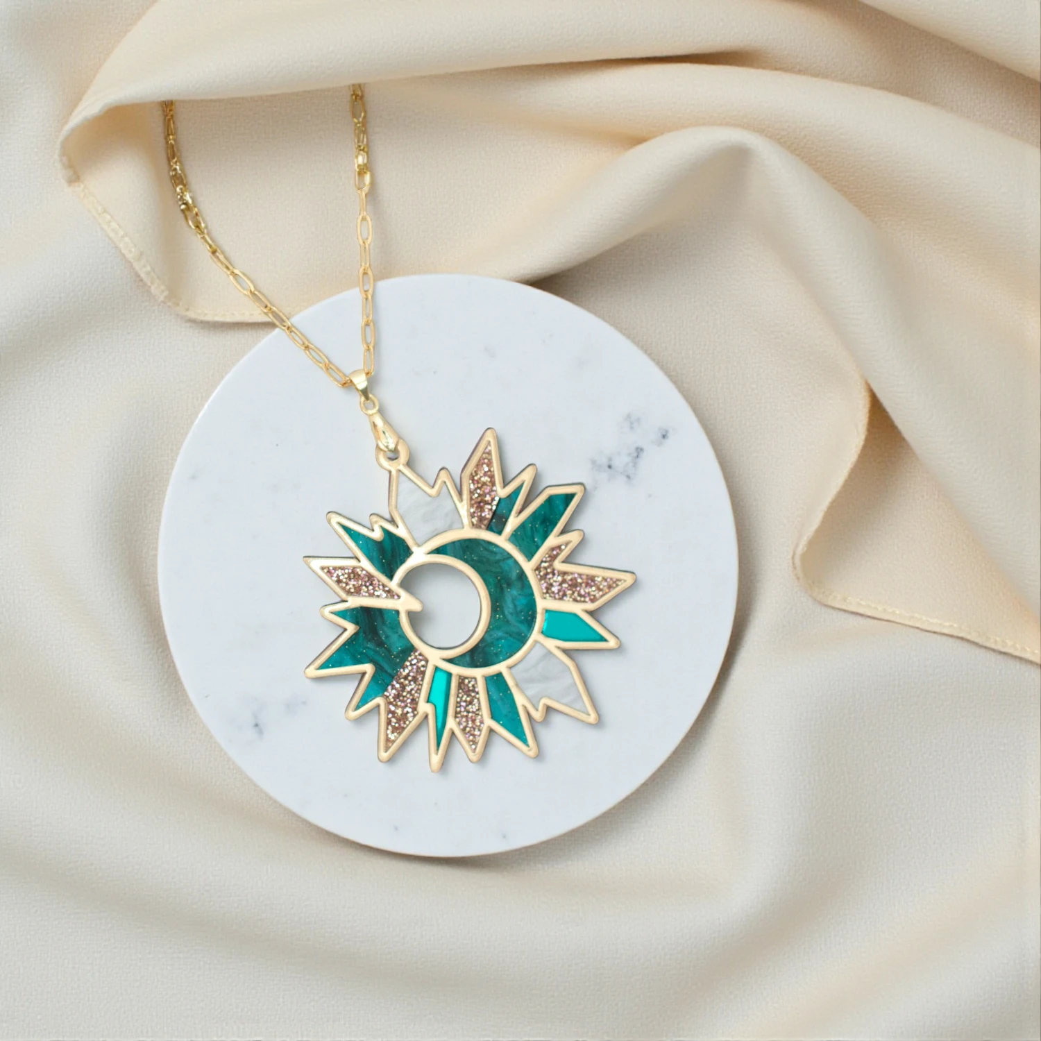 Inspirado en la danza del sol y la luna, el colgante SOLLVIN es una joya central que combina metacrilato espejo y nacarado en una pieza circular llena de energía.