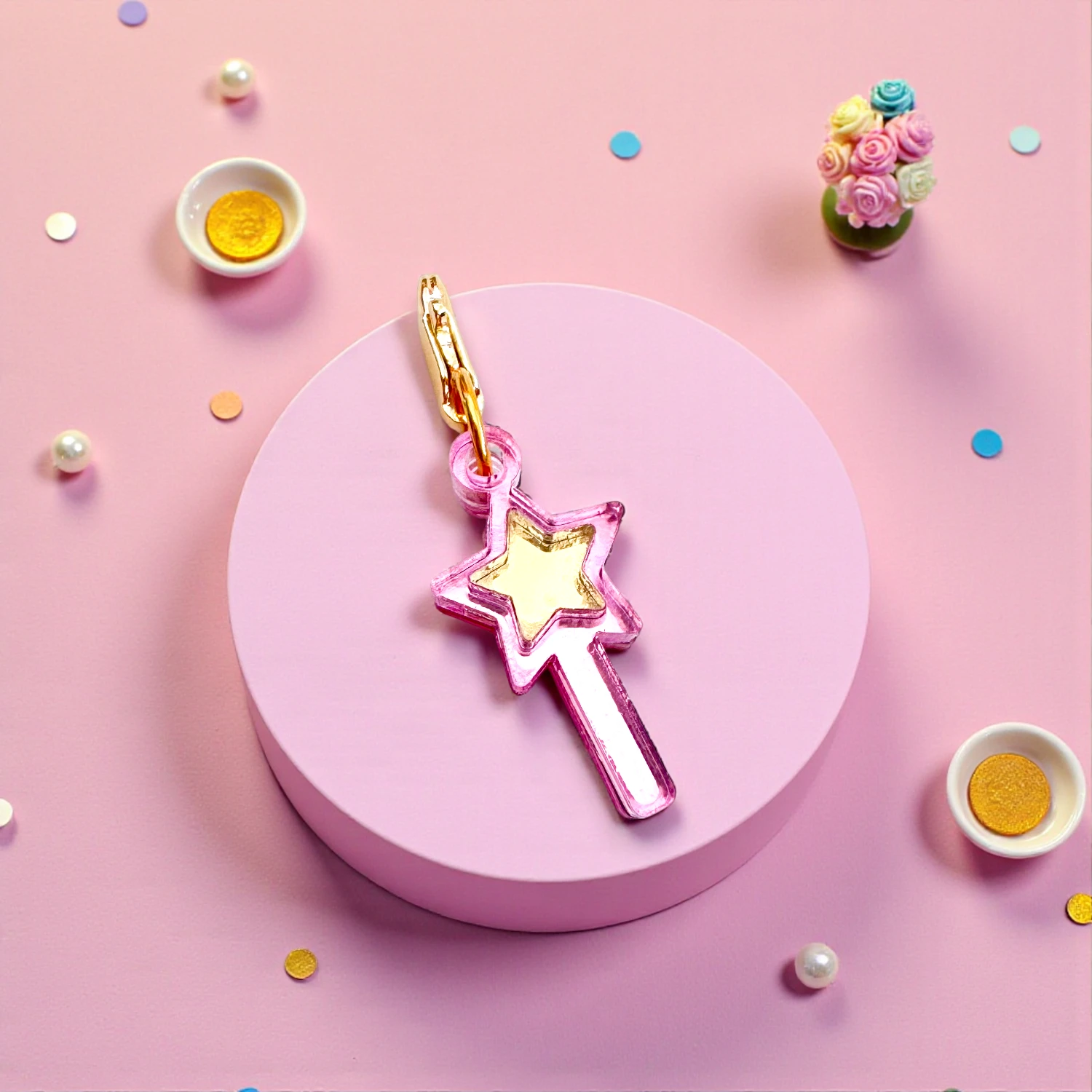 «Varita Mágica», el encanto perfecto para dar un toque de cuento a tus pulseras y collares. Hecho en metacrilato espejo con cristal austriaco, disponible con mosquetón en acero inoxidable o chapado en oro. ¡Crea tu combinación única!