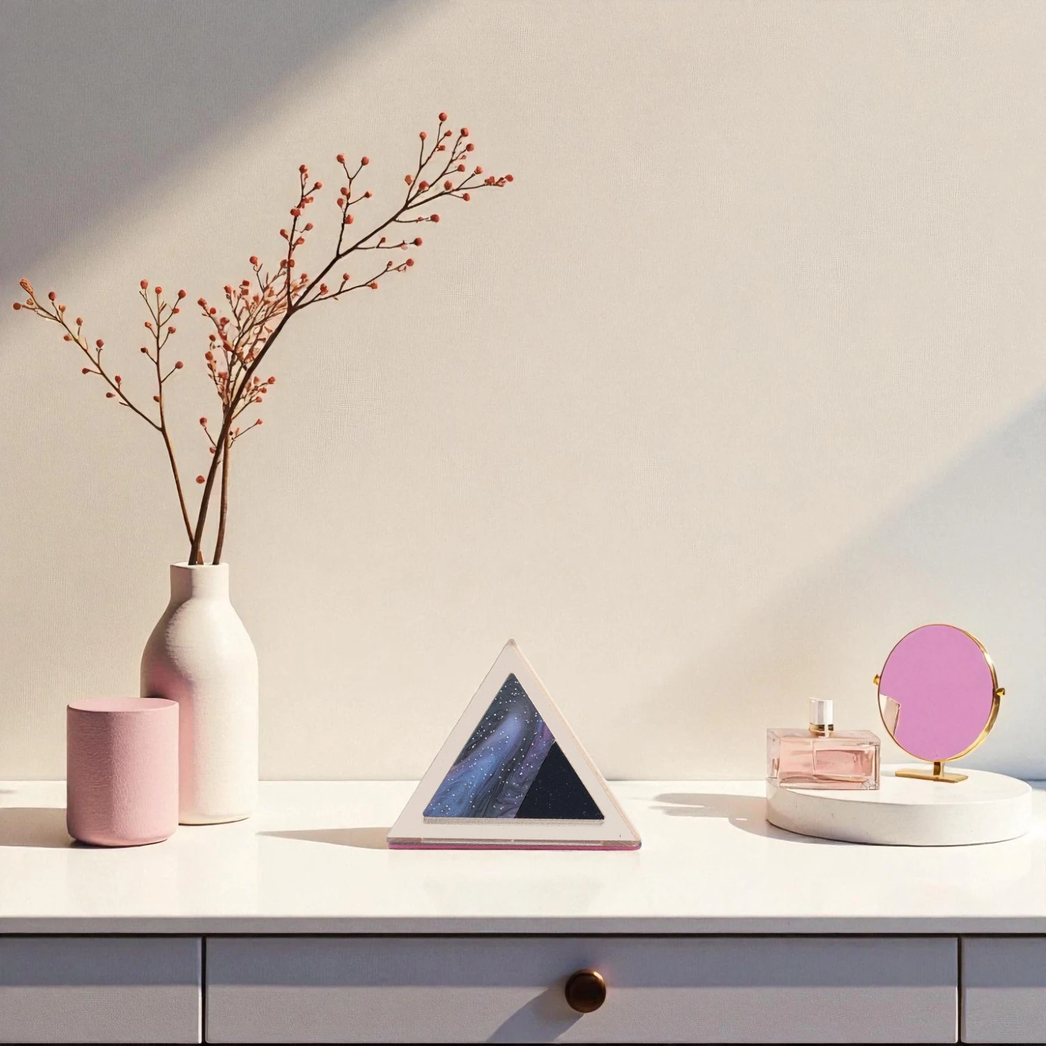 Este anillo en metacrilato espejo y nacarado combina forma, brillo y ligereza para elevar cualquier look. Su diseño triangular con reflejos galácticos es perfecto para quienes buscan originalidad y estilo sin renunciar a la comodidad.