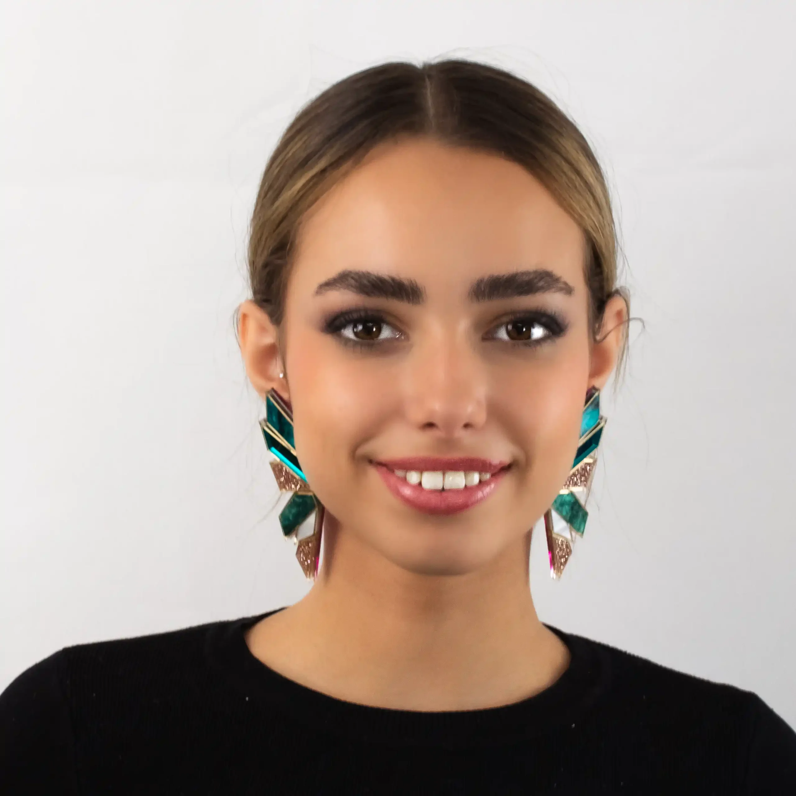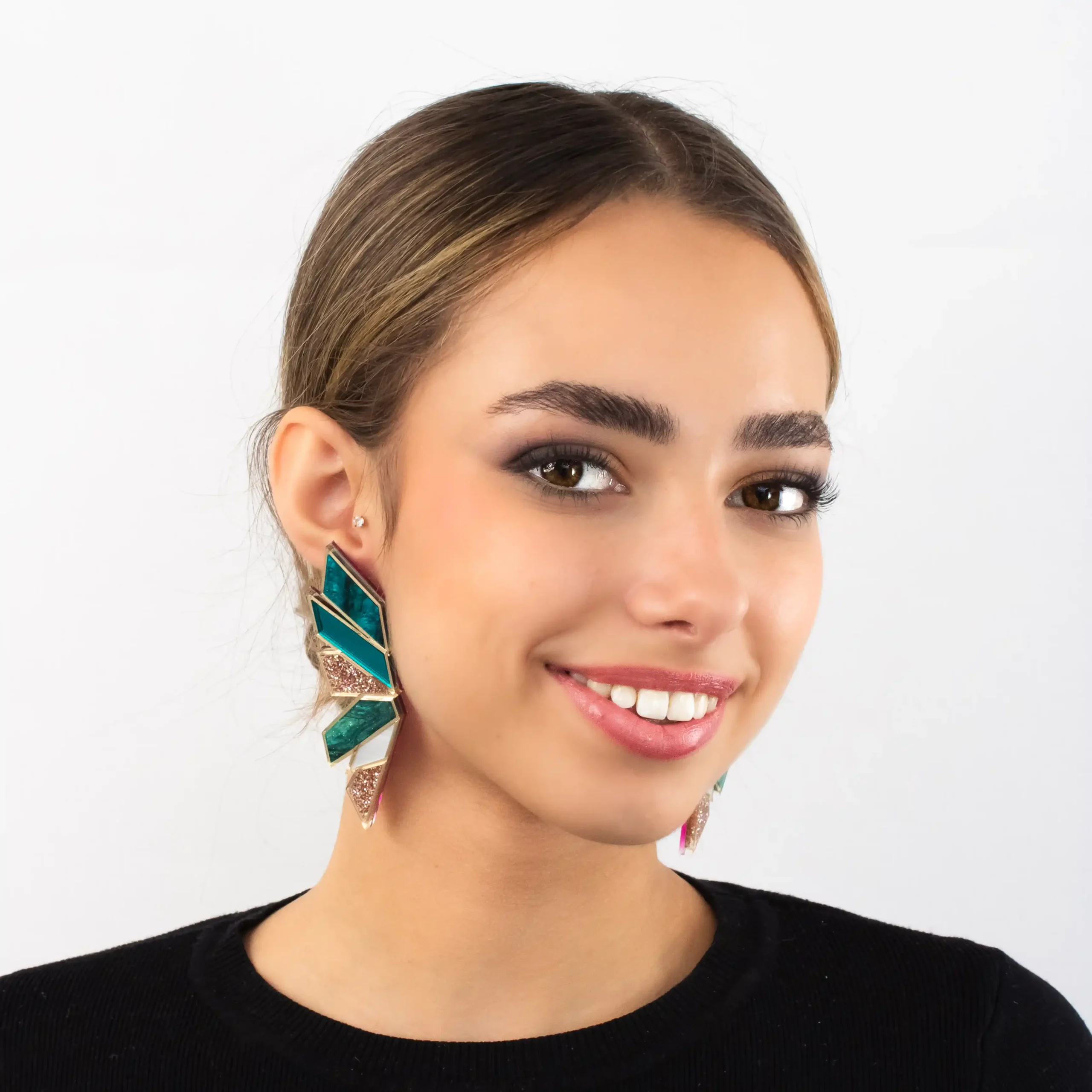 Pendientes FYRA en metacrilato espejo y nacarado. Maxi diseño de inspiración boreal. Cierre de presión dorado. Hechos a mano en España.